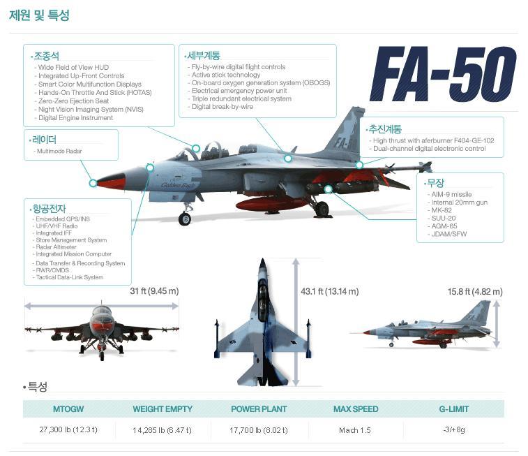 - [13] TA-50과 FA-50이 같은 레이더를 사용하고 있다. 당초 TA-50에는 AN/APG-67레이더를 사용하려고 했지만 F-20에 탑재된 레이더인 이 레이더를 공군은 능력이 부족한 것으로 판단하고 이스라엘의 EL/M-2032 레이더를 LIG넥스원이 기술이전받아 생산하는 방식으로 탑재하게 되었다. FA-50과 TA-50에 장착된 레이더는 이스라엘의 EL/M-2032 레이더지만, 적기 탐지거리가 다르다. 그이유는 EL/M-2032 레이더는 다양한 서브버전이 존재하며, 장착하는 기체에 맞게 레이더 디쉬의 직경이나, 레이더 전력장치등의 스펙이 조금씩 달라지도록 맞춤형 설계가 가능한 레이더이기 때문에 탐지거리또한 달라지게 된다. FA-50은 경전투기로 사용될것이기 때문에 보다 강력한 전력장비를 사용하여 탐지거리가 높은 것으로 추측된다.