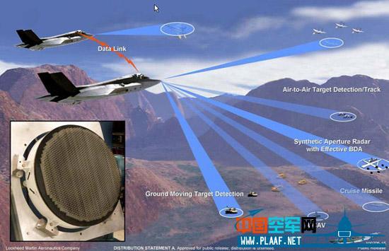 F-22의 기술을 최대한 활용한 간략화 버전이라고 할 수 있어서, 장착하는 레이더인 APG-81은 F-22가 장착하는 APG-77에 비해 하드웨어 상으로는 AESA 소자(레이더 소자)의 갯수만 600-700개 정도 뒤떨어지는 수준이고, 소프트웨어는 F-35의 대지공격 소프트웨어를 F-22에 재이식할 정도로 동급 수준이다. 또한 비용문제로 F-22에는 IRST(적외선감지추적장치)가 탑재되지 않은데 비해 F-35는 EOTS(전자광학추적장치) 및 DAS(분산개구적외선시스템)을 탑재하여 F-22대비 부족한 레이더 성능을 어느정도 만회하였다.