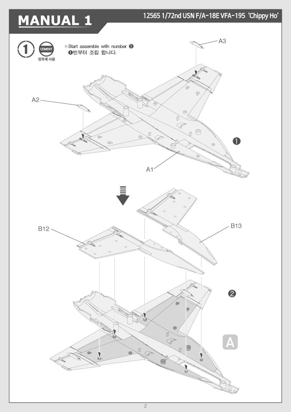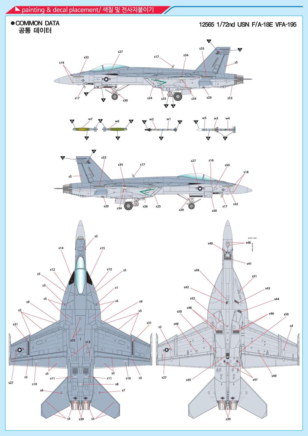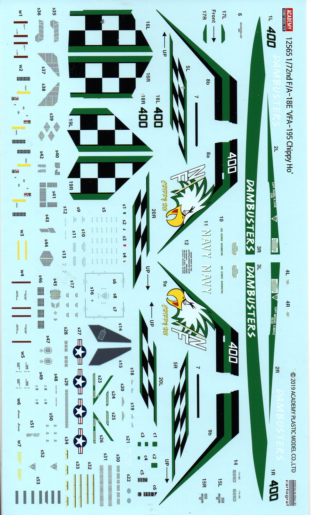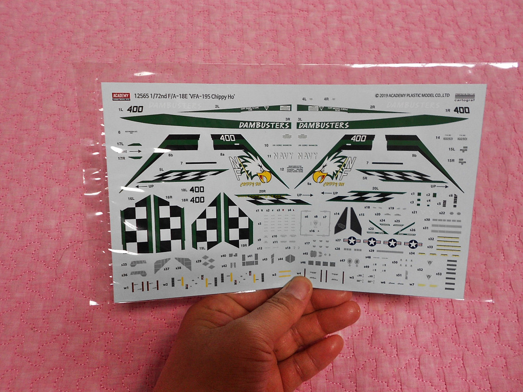 지난 2017년 출시된 아카데미의 F/A-18 수퍼호넷은 건프라를 조립하는 듯한 극장의 조립성과 72 스케일 이라는게 믿겨지지 않을 정도의 뛰어난 디테일을 가진 현재 가장 우수한 수퍼호넷 제품중 하나 입니다. 출시 당시 이미 예상했듯 현재 미해군의 거의 유일무일한 주력기이니 만큼 다양한 비행부대를 재현한 제품이 출시될 것이라 예상했습니다. 이에 맞추어 이번에는 댐버스터 라는 부대애칭으로 유명한 VFA-195 비행부대의 대장기인 Chippy-Ho 2017년 버젼을 재현한 제품을 출시하였습니다. 제품품질이야 잎서말했즛 마치 반다이사의 건프라를 조립하는듯한 착각이 들 정도로 오차도 거의 없고 딱딱 맞아들어가는 조립성 최고에 디테일 역시 뛰어난 제품입니다. 여기에 가격까지 착하니 뭐... 다만 설계상의 문제점인 무장이 단조롭고 파일런과 같이 몰드되어 있어 무장을 변경하기 어렵다는 문제가 있습니다만.. 골치아프지 않게 현존하는 미해군 최신기체를 만들어 볼수 있다는 점은 큰 장점이라 할 수 있을듯 합니다.