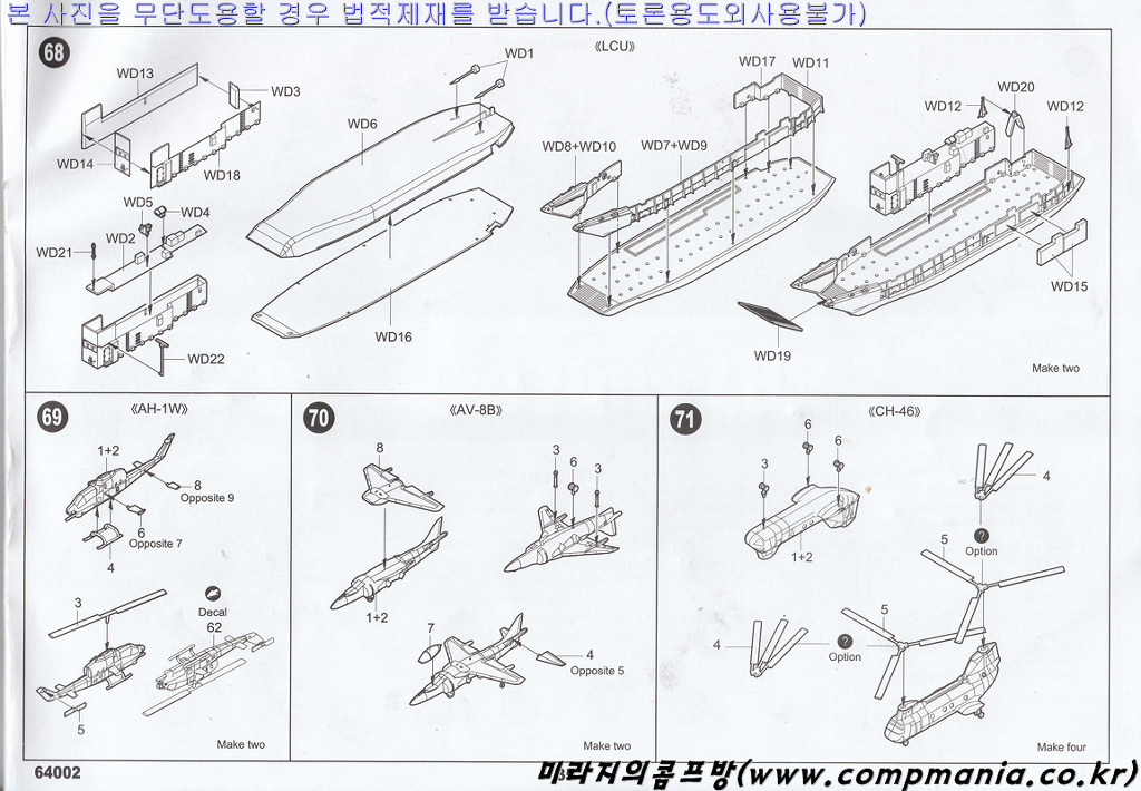 사실 전작인 트럼페터의 LHD-1 WASP 는 1/350 스케일 함선으로는 거의 완벽에 가까운 제품이라 할수 있는데 빅 스케일 함선모형이 가지는 장점들... 편리한 조립성과 웅장함 그리고 오밀조밀하게 잘 재현한 정교한 각종 함재기나 전차모형과 함선모형의 필수부품인 풍부한 에칭부품까지 모두 갖춘 일종의 풀셋제품으로 이 제품 하나만으로도 하나의 작품이 되는 제품 입니다.