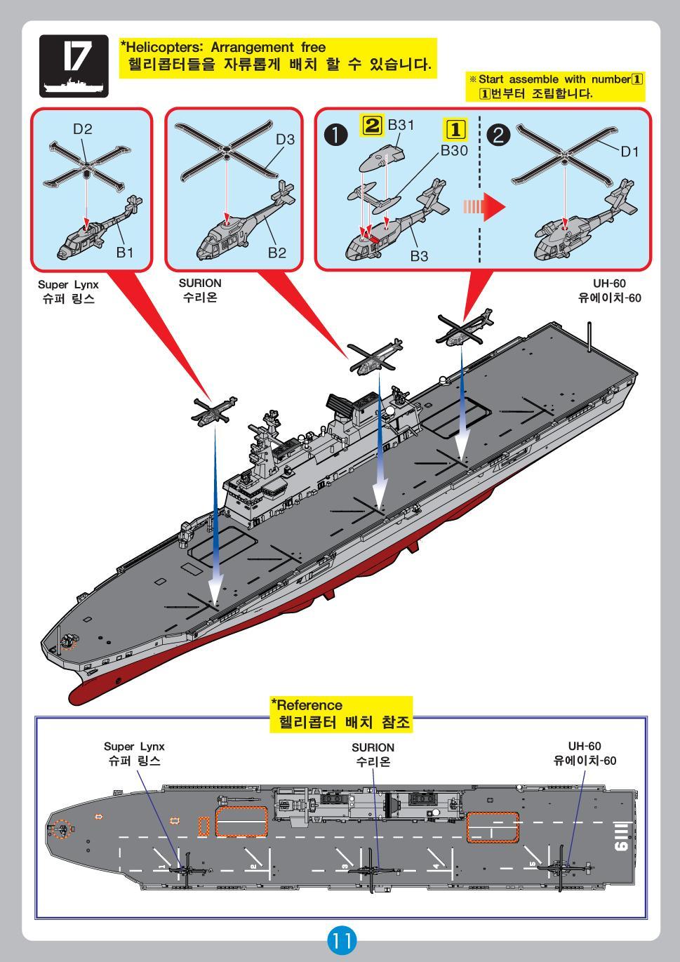 1. 대한민국해군의 강습헬기상륙함인 LPH-6111 독도함을 1/700 스케일로 재현 2. 모형용 페인트 없이 조립만으로 실제 기체를 재현 가능한 MCP 제품 3. 수리온, UH-60, 슈퍼 링스 함재 헬리콥터 각 1기씩 포함 4. 디스플레이 스탠드 포함