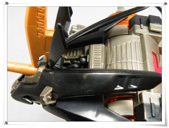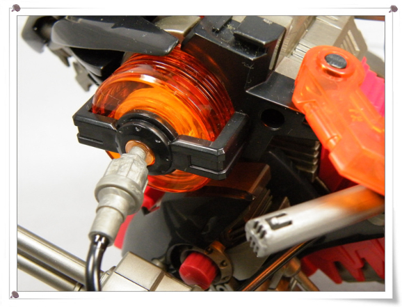 PUSH 버튼 위의 4개의 구멍은 에어탱크와 구동부를 연결해 주는 역할을 하는데 위의 2개는 날개에 고정시키게 되어 있습니다. 아래의 2개는 위와는 좀 틀린데, 에어탱크로 다리에 붙어 있는 개틀링 포가 움직이게 되어 있습니다. 개틀링 포를 구동시킬려면 에어탱크의 호스를 직접 캐틀링 포에 연결해야 하고, 날개를 구동시키려면 에어탱크의 호스를 저 아래 2개의 구멍에 연결해야 합니다.