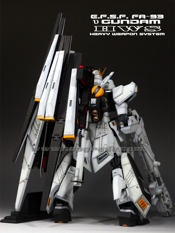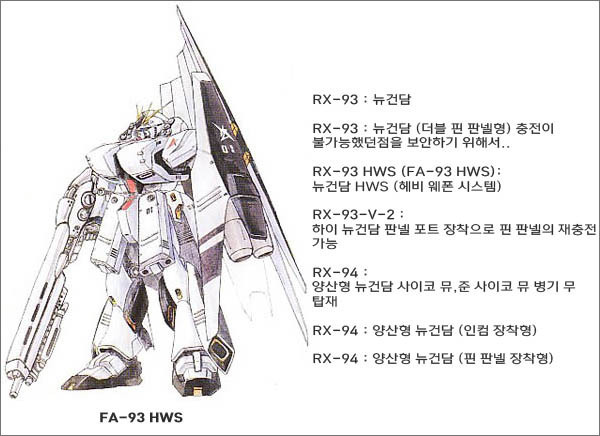 형식번호 : FA-93HWS 전고 : 전체 23.0m 머리 22.0m 중량 : 본체중량 27.9t 완비중량 87.0t 제네레이터 : 초소형 미노프스키 핵융합엔진, 출력 2980 kW 슬러스터 추진력 : 18300kg x 4, 12300kg x 2, 버니어 슬러스터/애퍼지 모터 26개. 가속력 : 1.12 G 센서 범위 : 21300 m 장갑재질 : 건다리움 감마 합금 디자이너 : 이즈부치 유타카 |