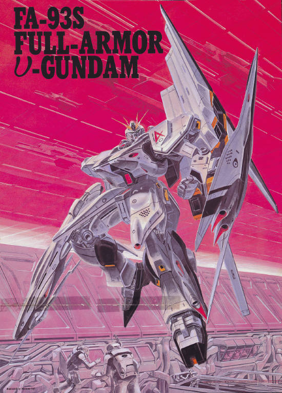 [건담, ΖΖ건담과 같이 컨셉부터 다수의 디자이너가 참가하여 비샤르 디자인의 스즈키 마사히사 등을 중심으로 수많은 러프 디자인안이 제출된 것을 이즈부치 유타카가 정리하였다. 이즈부치가 완성한 디자인에는 그의 영향이 강하게 반영되어 있다.]