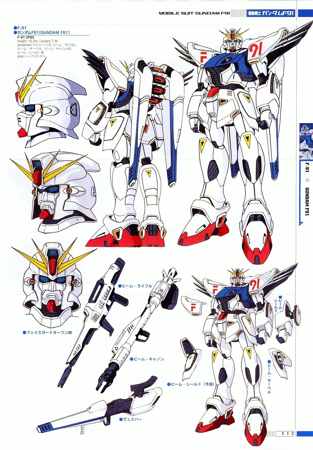 [F91은 다양한 빔 병기를 장비할수 있으며 최강의 무장은VSBR, 즉 베스바로, 어지간한 전함 주포급에 해당하는 화력을 가지고 있으며, 빔 실드조차 간단히 관통하는 사상초유의 초강력 빔 병기이다. 또한 빔 실드를 장비하고있기에 방어력도 매우 높고 실체방패를 장비한 모빌슈트들에 비해 경량화도 이루어졌다. 그 외 기본무장으로는 발칸포 2문, 메가 머신 캐논 2문, 빔 실드, 빔 사벨 2개, 빔 라이플, 빔 런처가 장비되어있다.]
