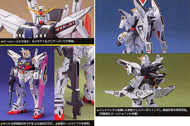 구판 무등급 F91은 아직도 회자될 정도의 전설적인 명품. 사진의 저 모습은 어떤 채색도 하지 않은 모습이다. 즉 기본적으로 색분할이 저만큼 되어있다. 심지어 어깨의 형식번호 마킹까지도 부분도색이 아니라 색분할로 처리되어있다. 당시 반다이는 최초로 시스템 인젝션 성형을 사용하기 시작하는 등 플라스틱 성형 기술이 급진하던 시절이었기에 새 건담 시리즈의 주역이 될 F91에게 이정도의 파격적인 대우를 해준 듯. 심지어 구판 치고는 사지의 가동성도 굉장히 뛰어나고, 구판에서는 보기 힘든 허리 회전이 된다는 것 자체로도 메리트 있다. 디테일도 어느정도 파여있고 프로포션 역시 F91 특유의 디자인을 잘 살리고 있어서 HGUC와 비교해도 위화감이 없을 정도. 다만 그래서인지 구판치고는 가격이 꽤 세다. 그래도 소장할 가치가 있는 물건.