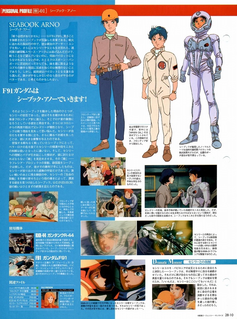 [극중 파일럿으로 등장하는 시북아노 Seabook Arno (シーブック・アノー Shībukku Anō?) 극중 크로스방가드이 사는 코로니를 급습하게 되고 우연히 타게된 연습함에 미완성으로 방치되어 있던 F-91 에 탑승 뉴타입으로 각성 놀라운 활약을 하게 된다. 이후 티비판으로 계속 등장할 예정이였으나 티비판이 흐즈부지 해지면서코믹스판인 기동전사 크로스본 건담에서는 '킨케두 나우'라는 가명을 쓰고 우주해적이 되어 지구연방을 손에 넣으려는 목성 제국과 전쟁을 벌인다.이 때 당시 나이는 28세.