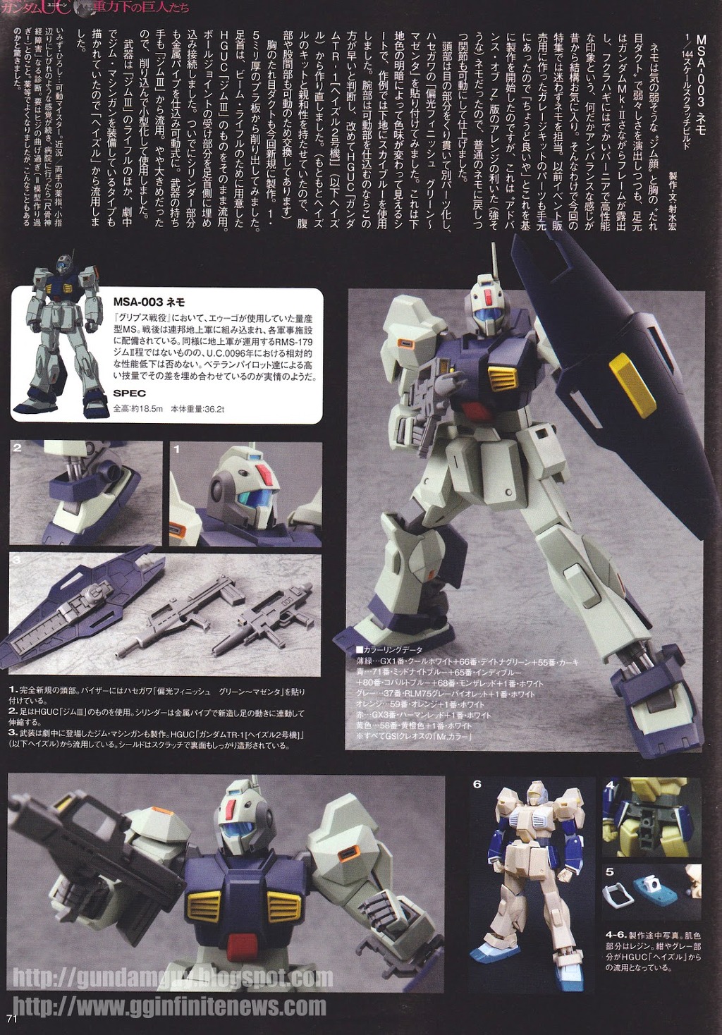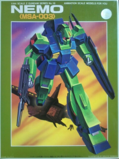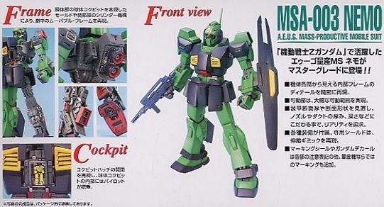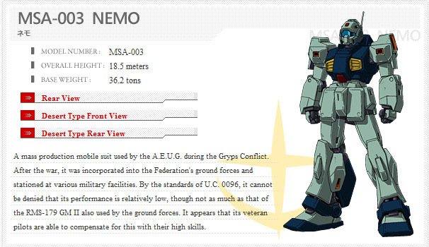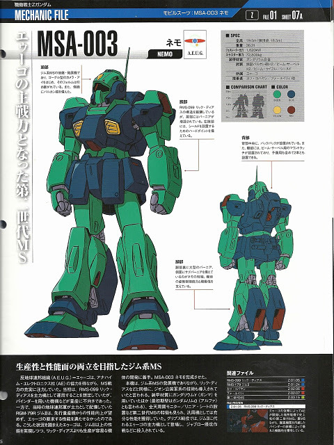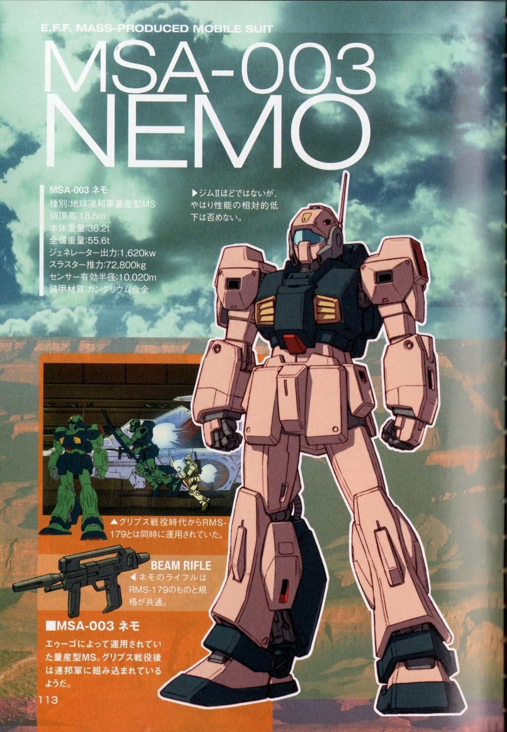 2. 소개[MSA-003 NEMO 는 기동전사 Z건담에 등장하는 에우고의 양산형 모빌슈트 로 에우고를 대표하는 주력기체 이다. 사진은 UC94년 당시의 칼러사양 에우고 사양으로 납품된 기체지만 당시로는 일부지만 연방군에서도 다수 사용하는것이 목격되었다. 칼러가 옅은 청회색으로 바뀌건것이 특징이다.] [에우코 컬러로 그린과 푸른청색의 칼러가 특징이다.] [UC94년경 목격된 데져트 패턴의 칼러도장 다카르 지역 수비군과 오스트리일리아 토링턴 기지 방어군이사용하는것이 목격되었다.칼러가 사막색으로 바뀌고 무장이 90밀리 건으로 바뀐건이 특징이다. 일부기체는 180밀리 건을 사용하는것이 목격되기도 하였다 ]