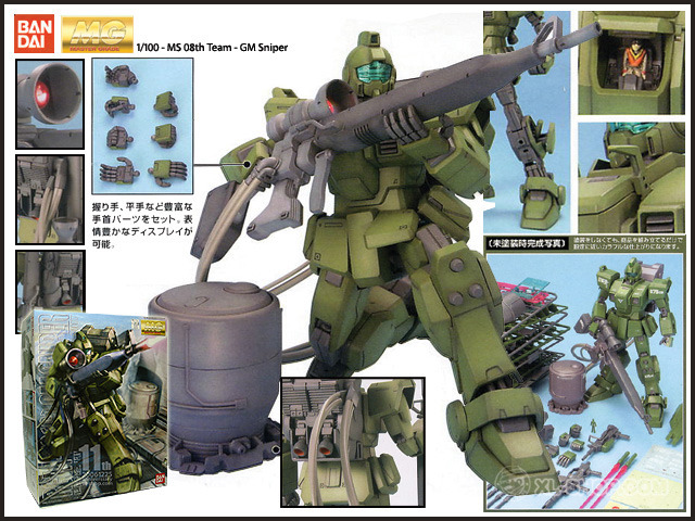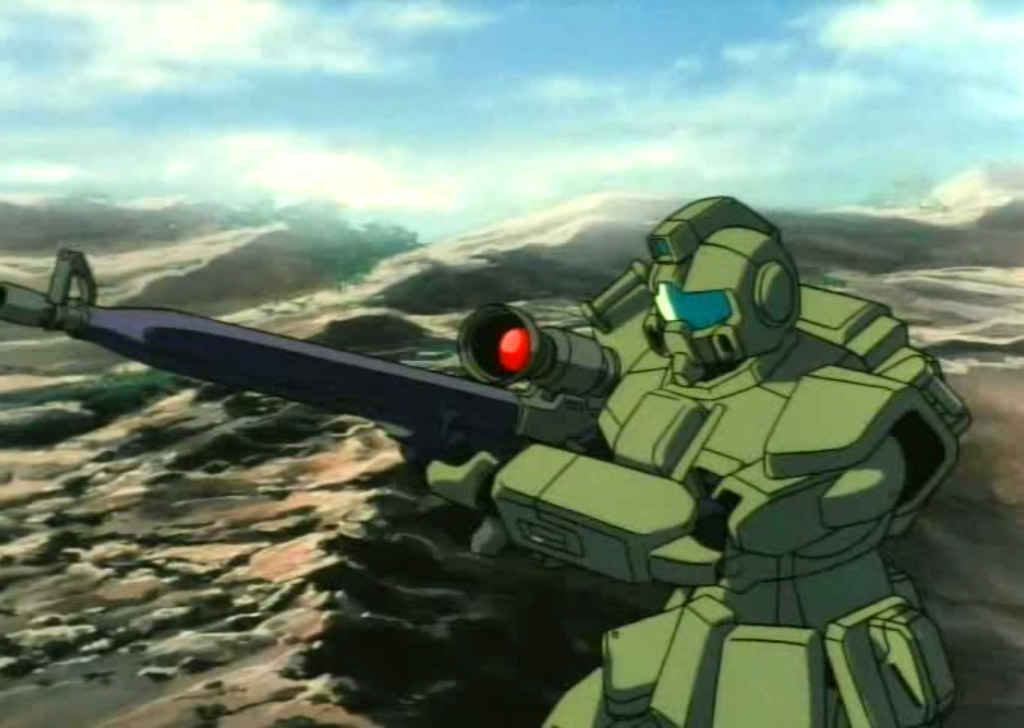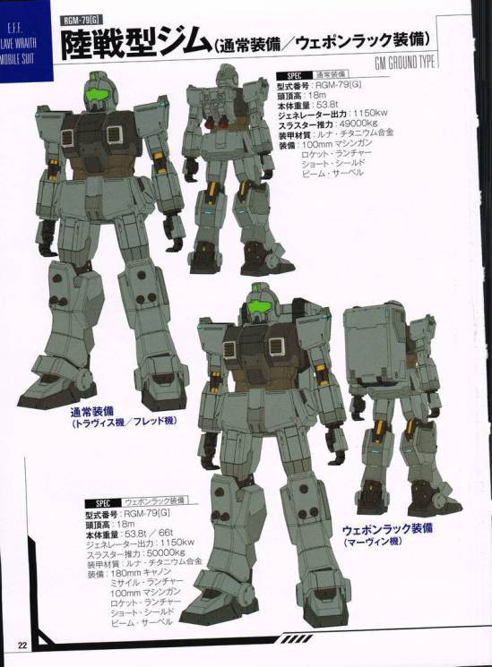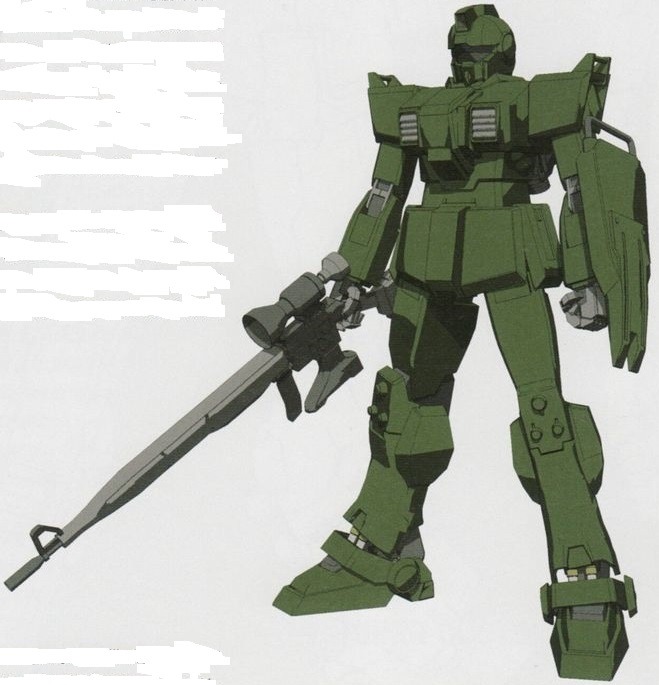 RGM-79G 짐 스나이퍼 : 1화 격납고씬에서 첫 등장. 위장을 목적으로 녹색이나 황갈색등으로 도색되었고 장거리 빔 라이플로 교체되어 일격의 위력을 더욱 향상시켰다.