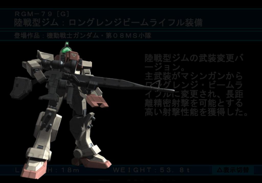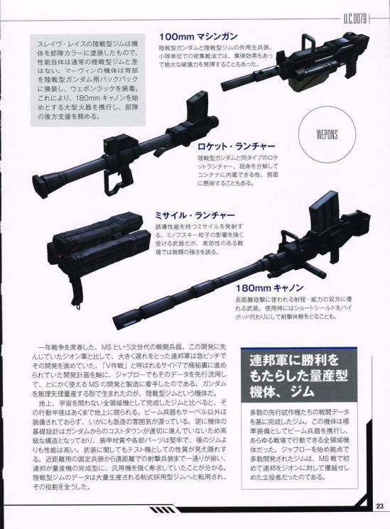 [ 무기도 공용되지만, 아무래도 제네레이터 출력이 낮은 관계로 빔 라이플을 주무기로 쓰기는 힘들다. 08소대 후반부를 보면 빔 라이플을 사용하는 육전형 짐을 볼 수 있지만. 또한, 육전형 실드 말고도 육각형 방패를 장비할 수 있다. 그림은 P.B.R-0079/A12 S-000011 Beam Rifle ]