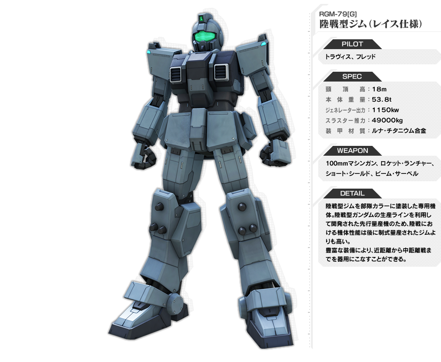 [RGM-79[G] GM Ground Type 육전형타입 짐은 육전형 건담의 잉여 부품을 짜맞춰서 생산한 기체로 건담의 생산성을 검증하기 위한 기체다. 코지마 대대에 주로 배치되었으며, 오뎃사 작전에도 투입된 기체들이 확인된다.]