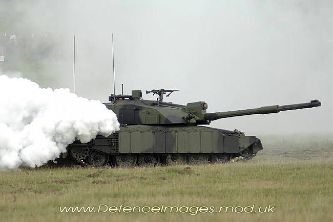 [120밀리 라이플포를 발사하는 챌린져 전차 영국은 과거 강선이 있는 라이플포를 최초로 전차에 장착한 전차의 종국국이으로 여전히 120밀리 라이플포를 고집하고 있는 유일한 서방제 전차이다. 이뿐아니라 독자적으로 운용하는 HESH(점착유탄) 때문에 다른 나토국가들과의 포탄의 호환성은 없다]