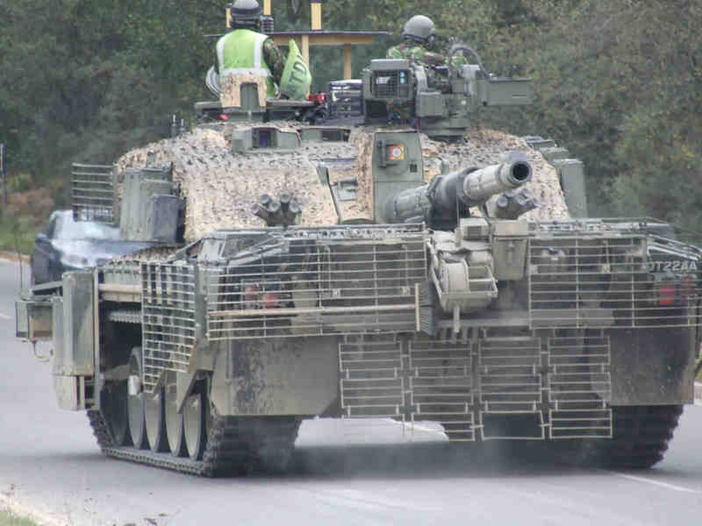 [바라쿠다 신형 위장막을 장착하고 주행중인 최신 챌린져2의 모습 챌린져2 는 당분간 영국군의 주력전차로 쓰일 예정이다]