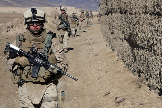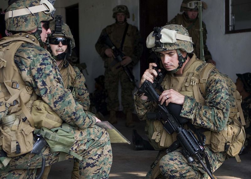 [앞서 설명한 MTV(Modular Tactical Vest) 를 착용하고 작전수행중인 미해병대원들의 모습 소총으로는 최신형의 M16A4 타입을 들고 있다. 선두의 대원은 아사카 산탄총을 들고 있다. 산탄총은 1차대전부터 해병댁 즐겨쓰는 무기중 하나이다]