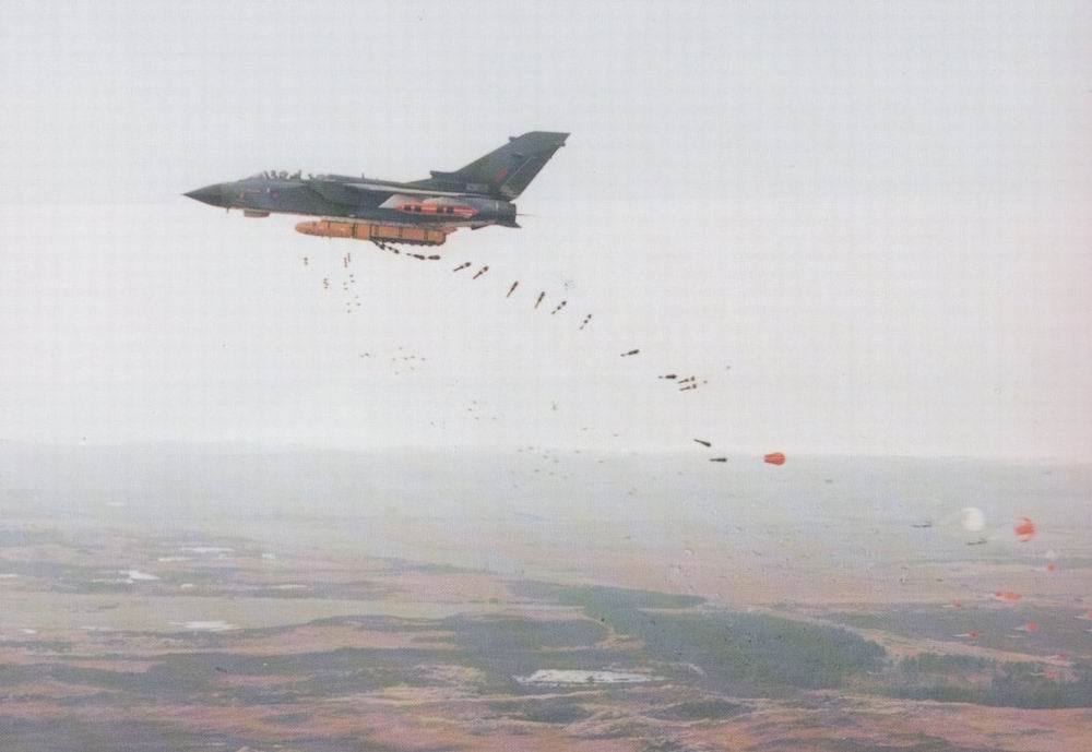 [영국공군이 맹신한 전술중 하나가 사진의 JP-233 으로 이는 컨테이너 속에 수백발의 자탄을 수납한 폭탄이다. 보통 저공침투를 적의 기지나 활주로에 이런 자탄을 흩뿌리는 임무를 맡은게 토네이도의 임무였지만 실제로는 대공포 나 지대공 미사일에 많은 수가 격추되었고 이내 이 쓸모없는 폭탄은 페기처분 되고 말았다 이후 토네이도의 운용방침은 이런 하드한 방식보다는 원거리에서 스탠드오프 미사일 발사를 통한 안전한 공격방식으로 전환하게 된다]