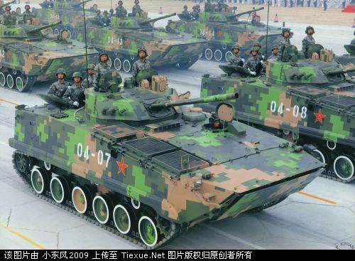 [지난 2009년 중국군 찰설 60주년 기념퍼레이드에 공개되어 큰 반향을 일으킨 중국군의 97식(ZBD970 ,ZBD-04) 신형보병전투차 의 모습 디지탈픽셀 위장도색의 느낌이 매우 강해 보인다]