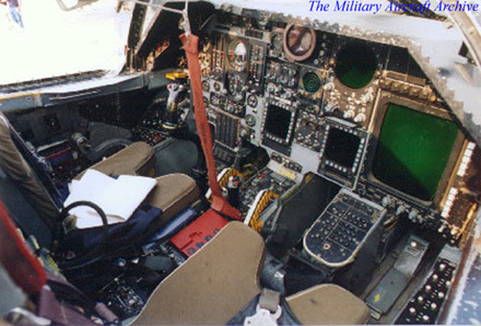 [조종석의 모습 현대적인 전투기의 조종석과는 상당히 다른 아날로그 방식을 취하고 있다 조종석에는 2명의 파일럿이 탑승하며 후방에서 봤을때 좌측이 파일럿 우측이 항법사 이다]