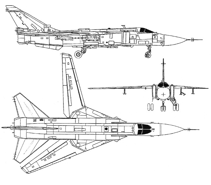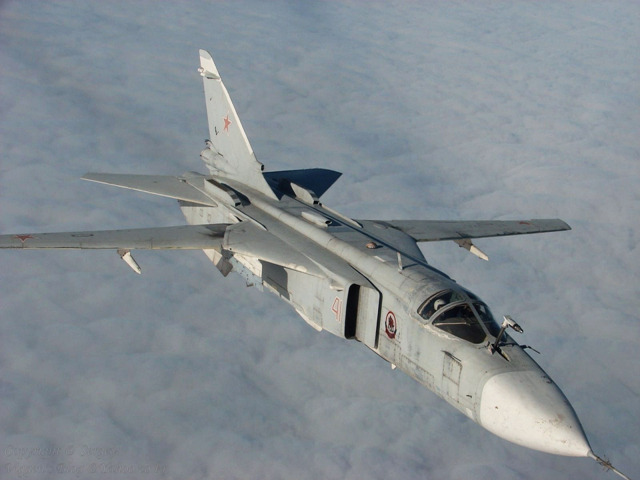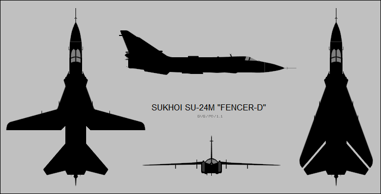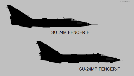 [Su-24 Fencer 구소련의 전천후 복좌전폭기로서, 가변날개를 채용하고, 정밀 폭격과 침투를 위한 장거리항법시스템과 광학병기시스템을 장비하였다. 적의 방공망 제압과 요새화된 목표 파괴를 위한 전선폭격기로 개발되었다. ]