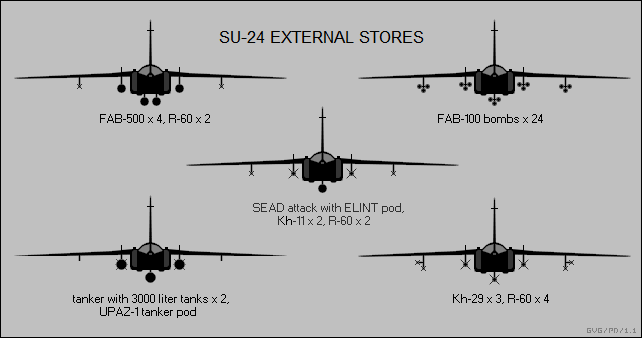 [ Su-24 Fencer 는 GSh-23-6 20㎜ 6총신 기관포 1문을 고정무장으로 장착한다. 기타 무장은 주날개와 동체 아래 9개 파일런에 탑재한다. TN-1000 TV 또는 레이저 유도 전술핵폭탄 4발, Kh-23·Kh-25ML·Kh-59·Kh-31A/P 등의 미사일, 57㎜~370㎜ 로켓탄 등 최대 8,000㎏을 탑재할 수 있다.이는 구소련기체 치고는 획기적으로 많은 무장탑재력이다]