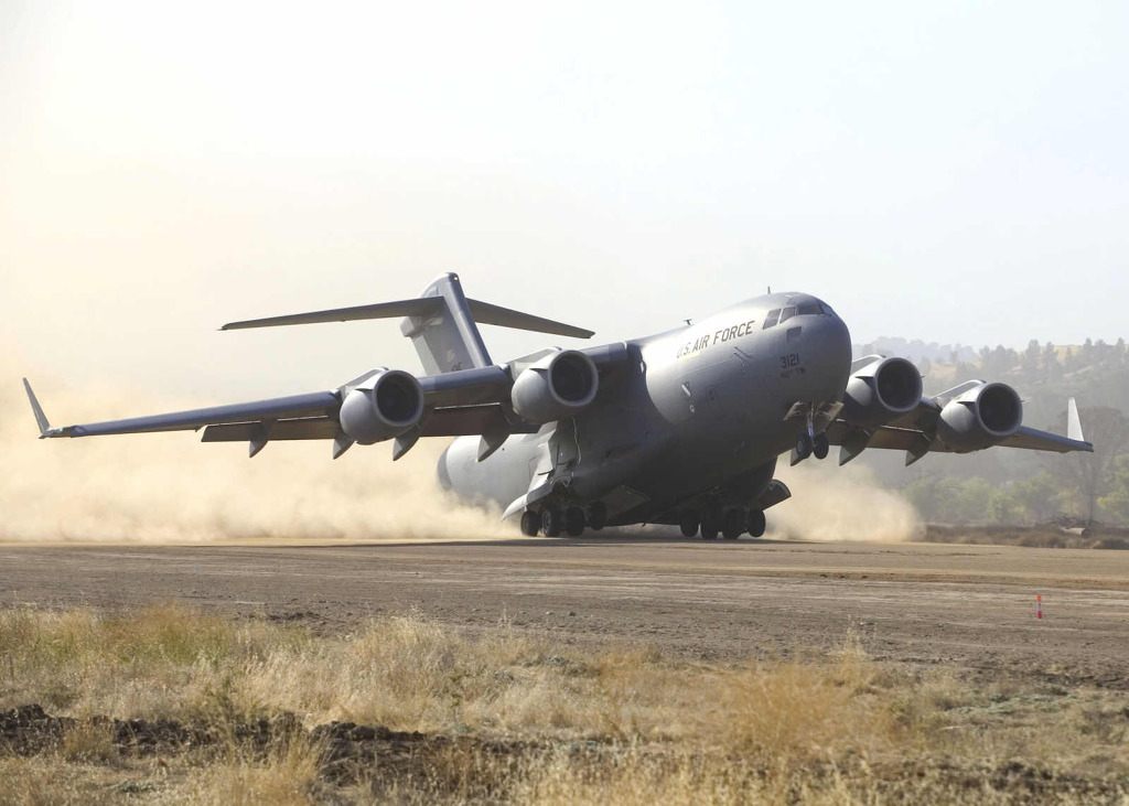[C-17 Globemaster III는 튼튼한 랜딩기어 설계와 4개의 강력한 엔진장착으로 이처럼 비포장 활주로에서의 이륙과 착륙이 가능한 유일한 대형수송기중 하나이다]