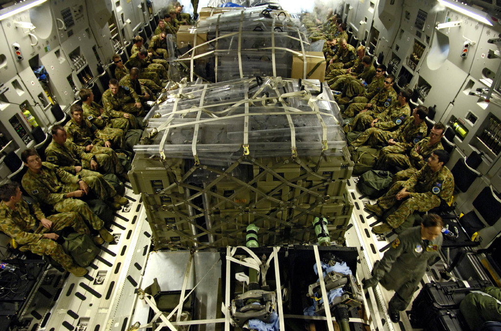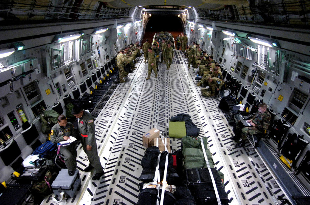 [C-17 Globemaster III 는 C-5 캘럭시와는 달리 후방의 램프를 이용 화물의 적재와 하역이 가능하며 후방램프는 적재시 그대로 차량이 진입할수 있는 경사로가 되는 구조이다]