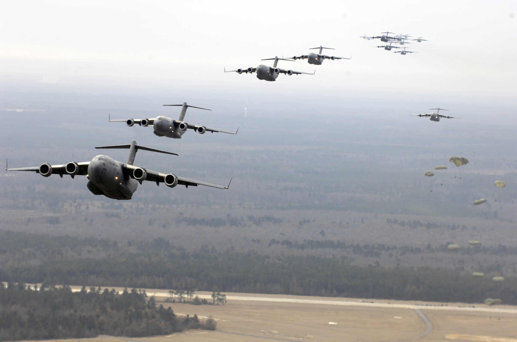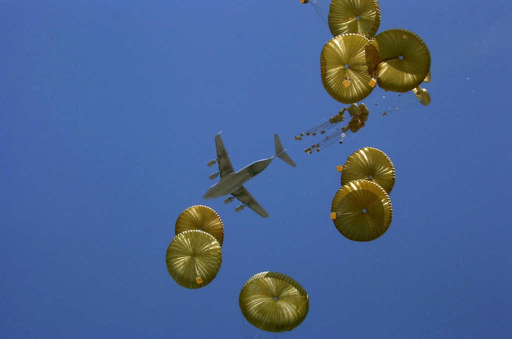 [화물을 공중 투하중인 C-17 Globemaster III 의 모습 이런 투하는 모두 전자동화 되어 있어 내부의 승무원이 스위치를 누를것만으로 한개 혹은 동시투하가 모두 전자동으로 되어진다]