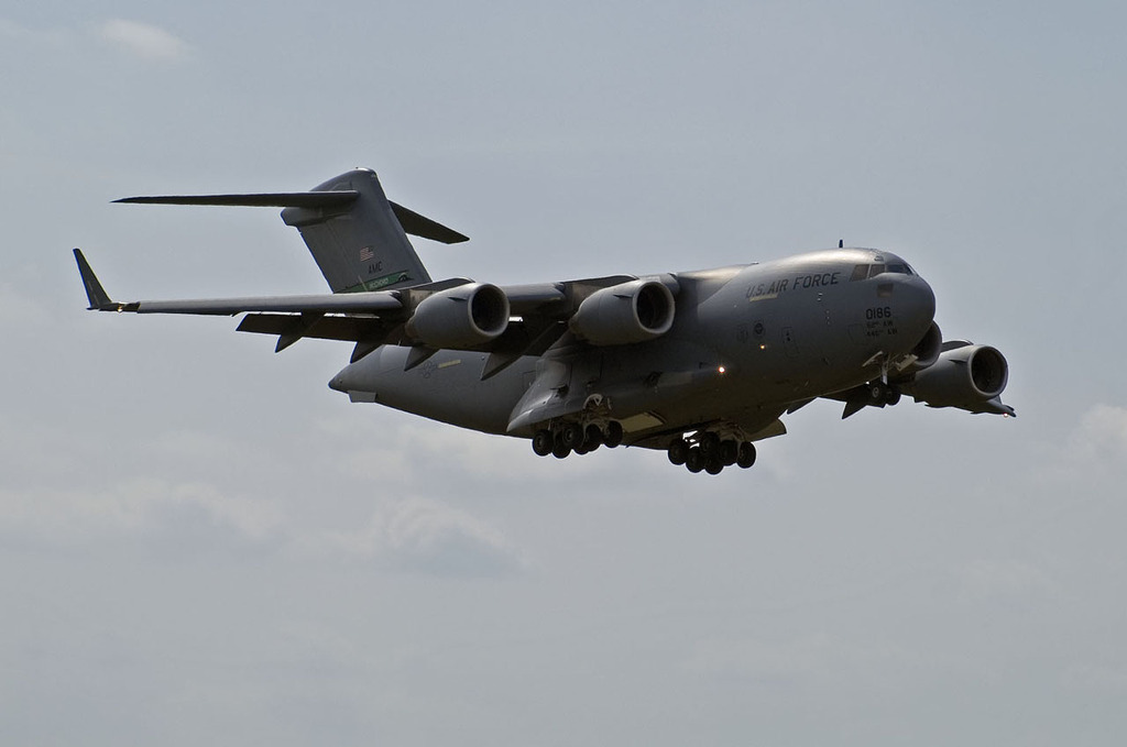 [이륙중인 C-17 Globemaster III ER 의 모습 이는 C-17 Globemaster III 의 최신버젼으로 초기형인 C-17 Globemaster III A형보다 증가된 연료탱크를 탑재한것이 특징이다. 이로인해 무급유로 제로 적재량시 11,160km를 비행하여 기존의 8,280km 비행거리와 대비 35%가 증가하였다. 또한 C-17ER은 1.1톤이 더 무거워져 최대운용적재량은 74톤으로 75톤의 C-17에 비해 줄었다]