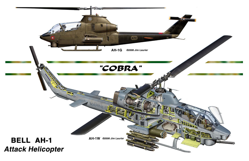 [AH-1G 는 수송용헬리콥터인 UH-1 이로쿼이즈를 호위하기 위해 만든 공격용 헬기로 UH-1의 설계를 바탕으로 공격임무에 맡게 재설계한 기체이다 AH-1W 는 휴이의 최신 버젼헬기로 현재 미해병대등이 채용하고 있는 AH-1 의 최신버젼이다]