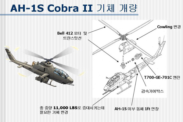 [이런 개량사업은 2020년이면 기체수명이 다하는 한국군의 AH-1F형에 수명연장을 위한 대안중 하나지만 정작 한국군에서는 그다지 큰관심을 보이지 않고 있다. 한국군에서 원하는것은 바로 AH-64 아팟치급의 공격헬기를 새로 도입하려는것인데.. 대당 가격이 웬만한 전투기 한대값을 호가하는 가격이라 쉽지많은 않은게 현실이다.]