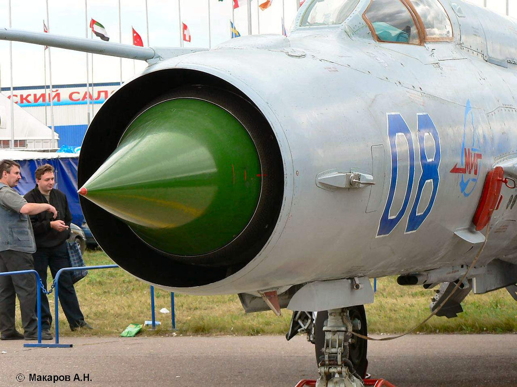 [미그21의 외형적 특징이 되는 기수 부분의 독특한 노즈콘은 앞서 이야기한대로 장착되는 투만스키 엔진때문에 생긴 기체 디자인으로 서방체 전투기에 장착되는 작고 강력한 층류식 엔진이 개발되기 전까지 모든 소련전투기는 이런 기체 디자인을 택할수 밖에 없었다. 하지만 바로 엔진에 공기를 주입할수 있고 노즈콘의 가동에 따라 에어량을 조절할수 있어 마하2.2 에 이르는 초음속 비행이 가능했다]