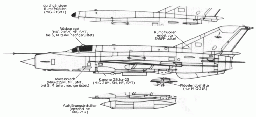 [MIG-21MF 는 베트남전을 교훈으로 문제점을 대폭 개량한 기종으로 미그21기제중 가장 많은 생산을 한 기종이기도 하다. 추력이 증가된 투만스키 R-13-300 엔진과 조종석 후부부터 수직미익으로 이어지는 페어링이 큰 특징으로 이곳에는 주로 전자장비와 추가 연료틍이 탑재되었다]