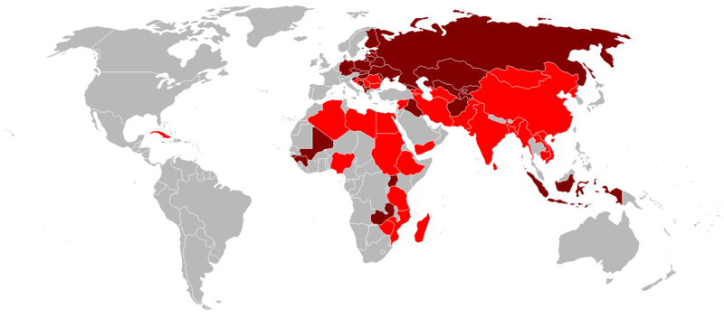 [미그21이 사용되었거나 (짙은색) 현재 사용중인 국가 (붉은색) 미그21은 전세계 20여개국이상에서 사용되었고 생산수량만 13,000 대가 넘을 정도로 초음속 전투기중에는 최대 생산 및 최대 운용국을 자랑하는 전투기이다. 그야말로 미친듯히 만들어 미친듯 뿌렷다고 밖에 볼수 없는 공산진영를 대표하는 기체가 바로 미그21 이라 할수 있다. 참고로 서방제 전투기중 최고 많은 생산대수를 자랑하는 기체는 F-4 팬톰 II 씨리즈로 그래봐야 5천대 정도이다]