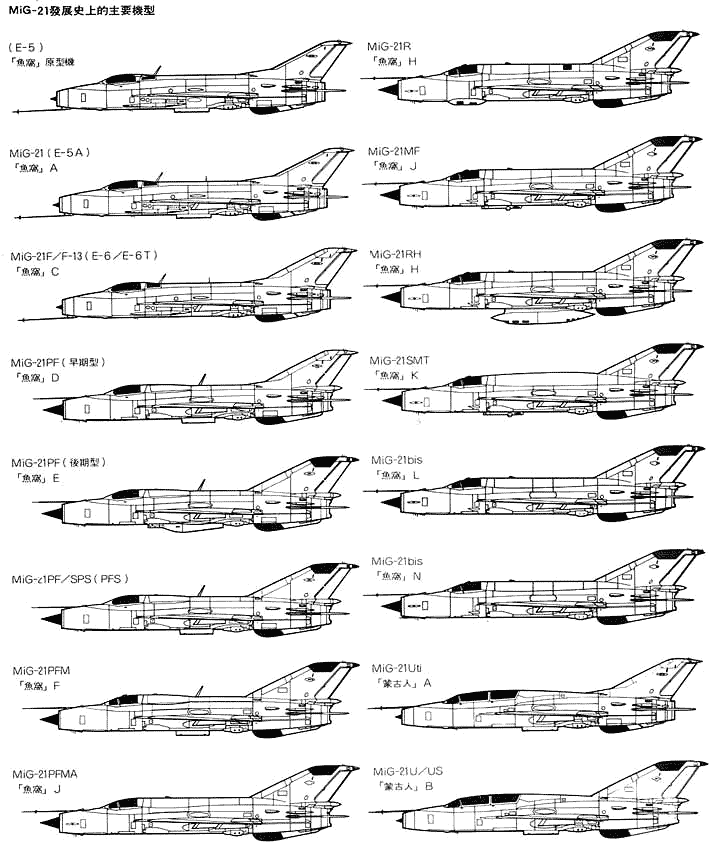 [미그21의 다양한 비리에이선을 나타낸 일러스트 30여년간 13000여대가 생산된 모델인캄는 총 16가지의 다양한 바리에이션이 있는 유래를 볼수 없는 다양한 모델을 보여주고 있다]