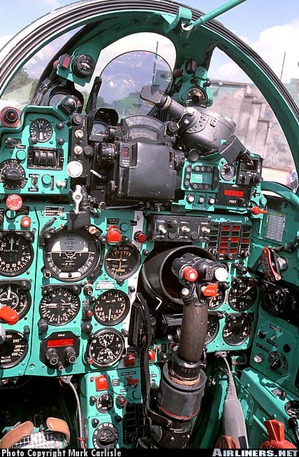 [미그21의 조종석인 전형적인 아날로그 방식의 조종석으로 전혀 인체공학적인 설계가 아니다. 이런 복잡한 조종환경은 조종사에게 주는 피로감이 매우 높았으며 서방제 전투기를 조종하는 조종사들에 비해 전반적으로 기량이 떨어지는 주된 이유이기도 했다 미그21 1~2기의 조종계기판의 모습]