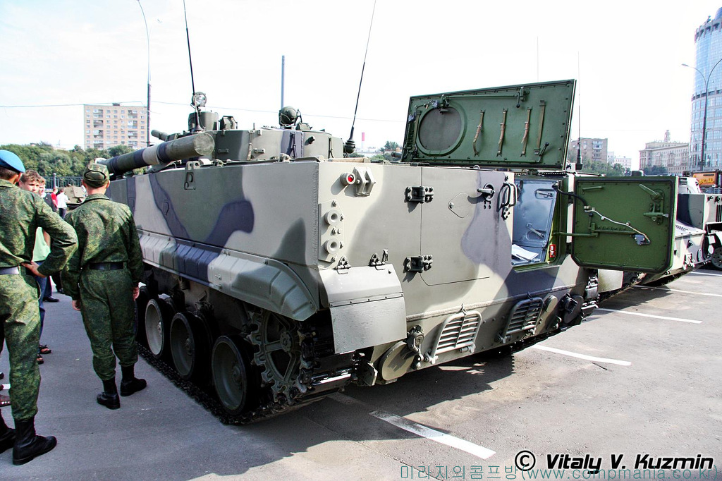 [BMP-3는 전차수준의 강력한 무장과 수륙양륙의 기동성을 가진 장갑차로 6명의 완전무장한 보병을 태울수도 있다 하지만 후방 출입구에 엔진이 차지하고 있어 거주성은 그리 좋은편이 아니다]
