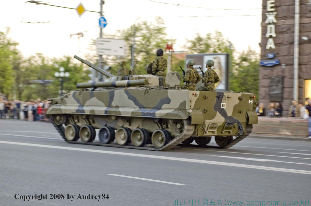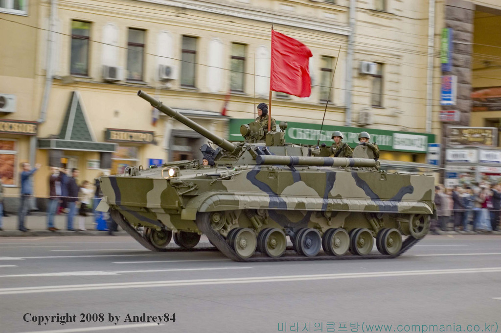 [BMP-3 는BMP-2에 이어 개발된 것으로 BMP-2가 BMP-1의 차체를 그대로 이용하고 무장을 바꾼 개량형인데 비해 BMP-3은 완전히 다른 차량으로 개발되었다. 러시아에서 BMP-3은 1990년 5월 군사퍼레이드에서 처음으로 공개되었으며, 부대 배치는 1989년부터 시작되었던 것으로 알려지고 있다. 사진은 러시아의 승전퍼레이드중의 주행중인 BMP-3의 모습]