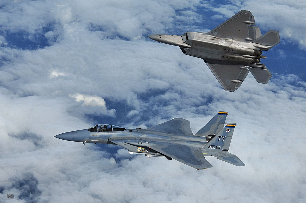 [F-22 랩터와 같이 비행중인 F-15C형이 모습 원래대로라면 랩터가 F-15C를 대신하여 모두 배치되어야 하지만 랩터의 비싼 가격과 최근 세계 제1의 경제대국인 미국마져 휘청이게 한 경기여파의 영향으로 당분간 F-15가 랩터를 대신해 2020년 까지는 운용될것으로 보인다]