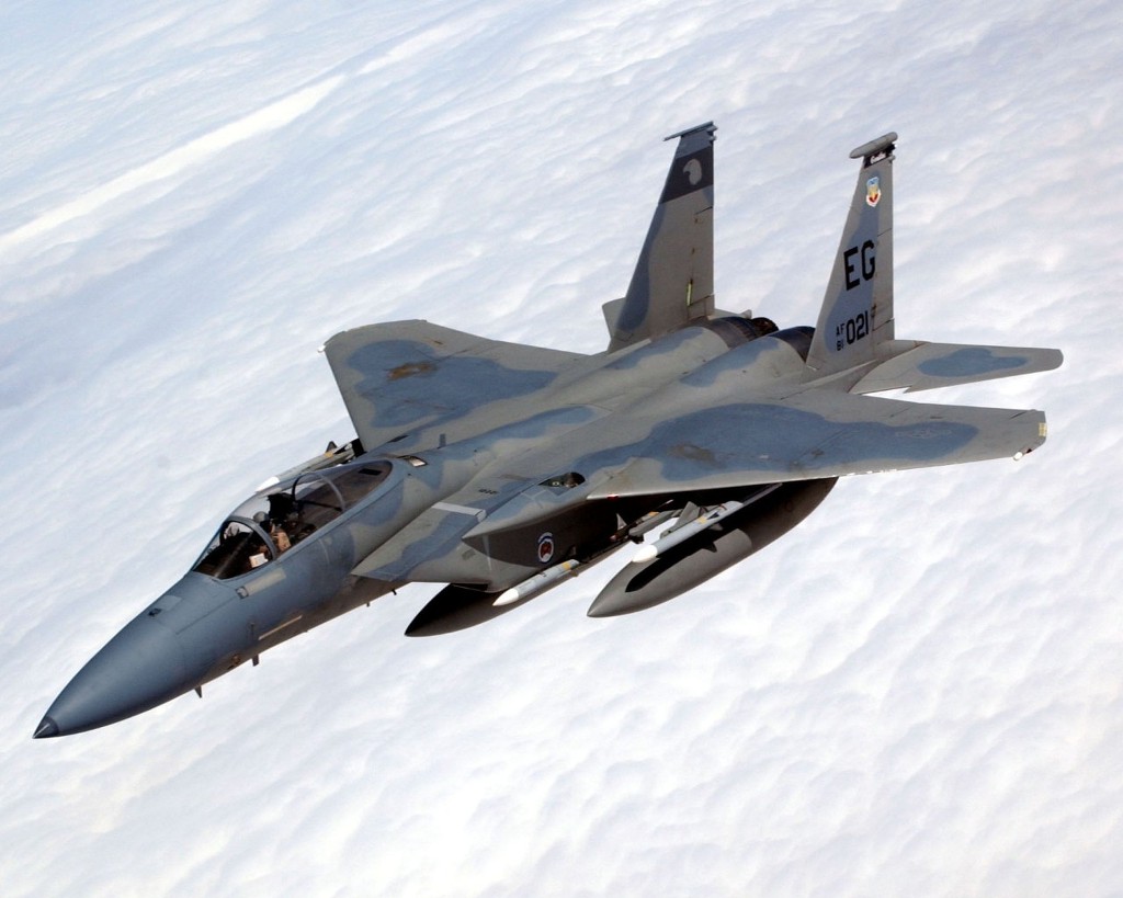 [폭장을 하고 비행중인 F-15E 초기형의 모습 F-15는 거대한 동체와 강려한 엔진을 쌍발로 장착한 덕에 총 11톤의 무장을 하고도 마하 2 이상의 비행이 가능한 기체가 되었다. 이는 2차대전 당시 4방 중폭격기인 B-17의 무장 탑재력의 거의4배에 해당되는 탑재량이였다]
