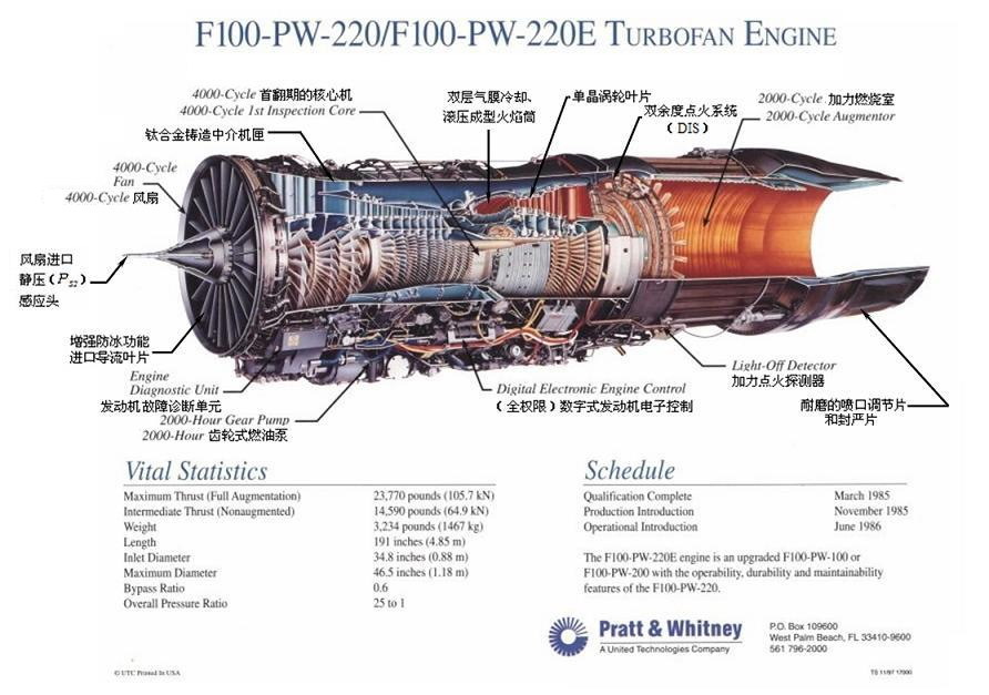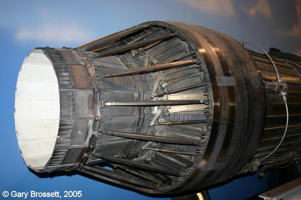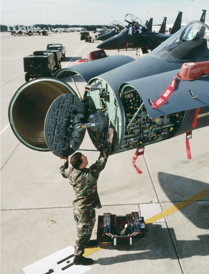 [F-15의 주력엔진인 F100-PW-100 의 모습 F-15는 10,810kg의 강력한 추진력을 가진 이 엔진을 두개나 장착하고 있으며, F-15의 경우 아무런 장비도 지니지 않은 채로는 추력대 중량비가 1을 넘는다. 이는 이글에 있어 로켓보다 더 우수한 수직 상승력을 가지는 원동력으로 이글은 이들 엔진에 의해 순식간에 수직으로 급상승이 가능하다 ]