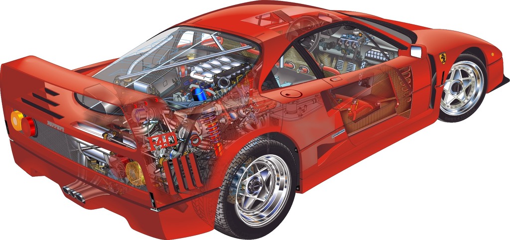 [페라리 F40은 화려한 디자인에 걸맞는 강력한 엔진을 장착하고 있는데 2.9ℓ크기의 트인터보차져가 장착된 V8엔진에, 최고출력은 478 마력을 과시하는 인터쿨러가 장착된 트윈터보로, 최신의 엔진기술과 보강장치는 가히 놀랄 만한 수준이다]