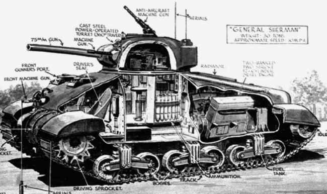 [셔먼전차의 구조를 알려주는 재미있는 만화중 하나 셔만전차의 구조는 어떠한 전차보다 간결했으며 이는 대량생산에 절대적으로 유리한 구조였다]
