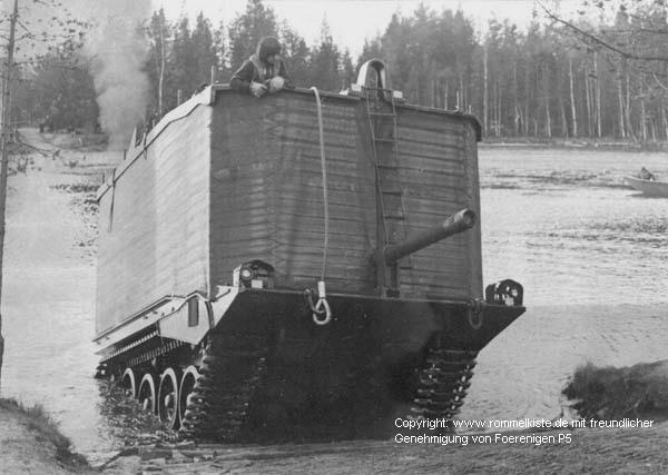 [험난 한 산악지형과 강이 많은 스웨덴 지형의 특성상 별도의 장비 없이 도하가 가능한 기능을 당시의 전차라면 모두 가지는 중요한 기능중 하나였으며 S전차 역시 스크린을 쳐 도하가 가능했다]