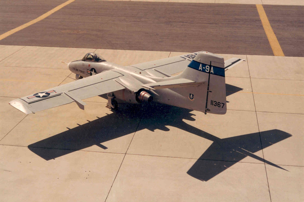 [SU-25 는 A-10 의 설계사상과 비슷하지만 사실은 A-10 과 경쟁을 벌이던 노스럽사의 A-9 의 영향을 더 받은 기체에 가깝다 사진은 시험기로 제작된 A-9 의 모습]