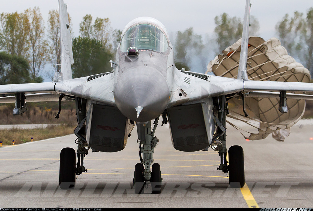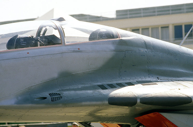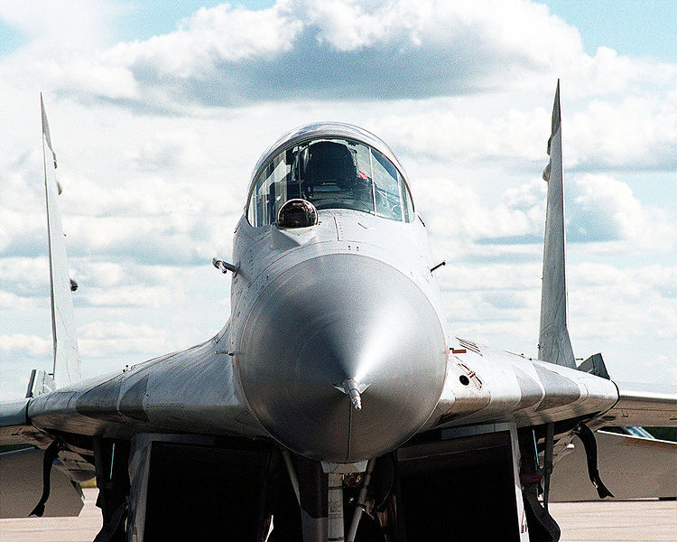 [미그29의 전방모습 보디-윙블렌딩 구조와 아래의 대형화된 에어인테이크의 모습을 잘 볼수 있는 사진이다. 소련기체답게 기체설계는 상당히 튼튼하게 잘 되어 있는편이다]
