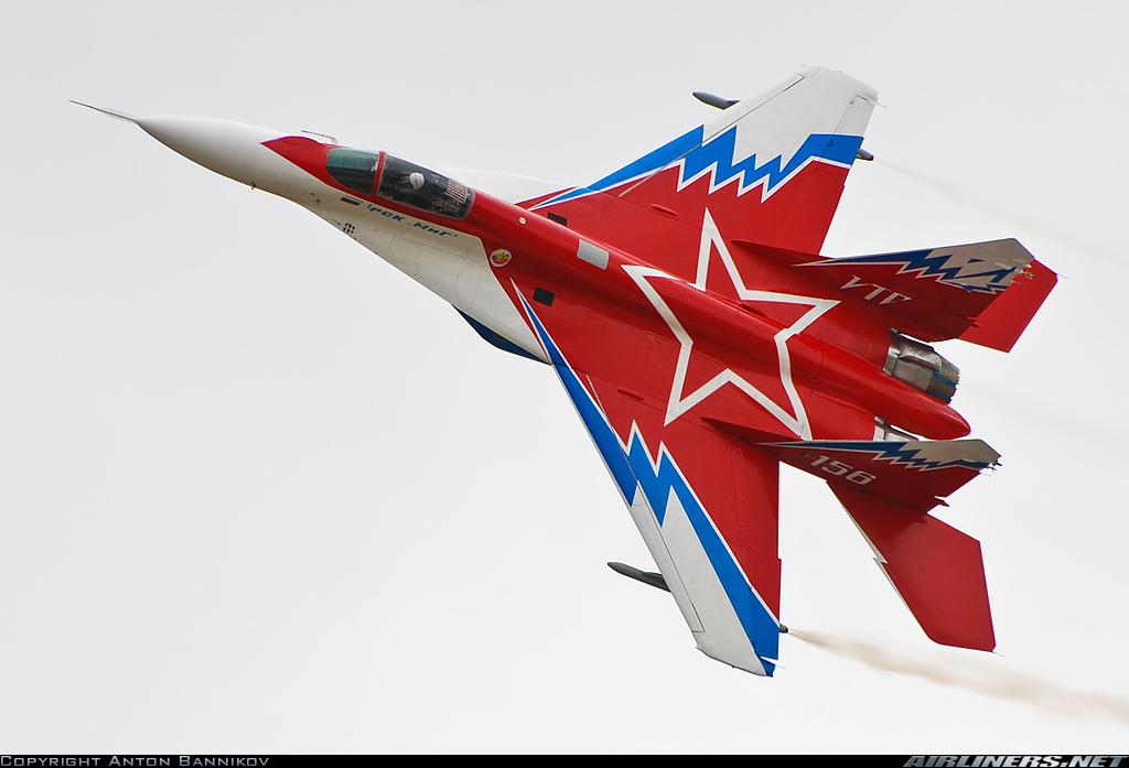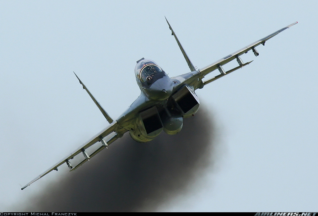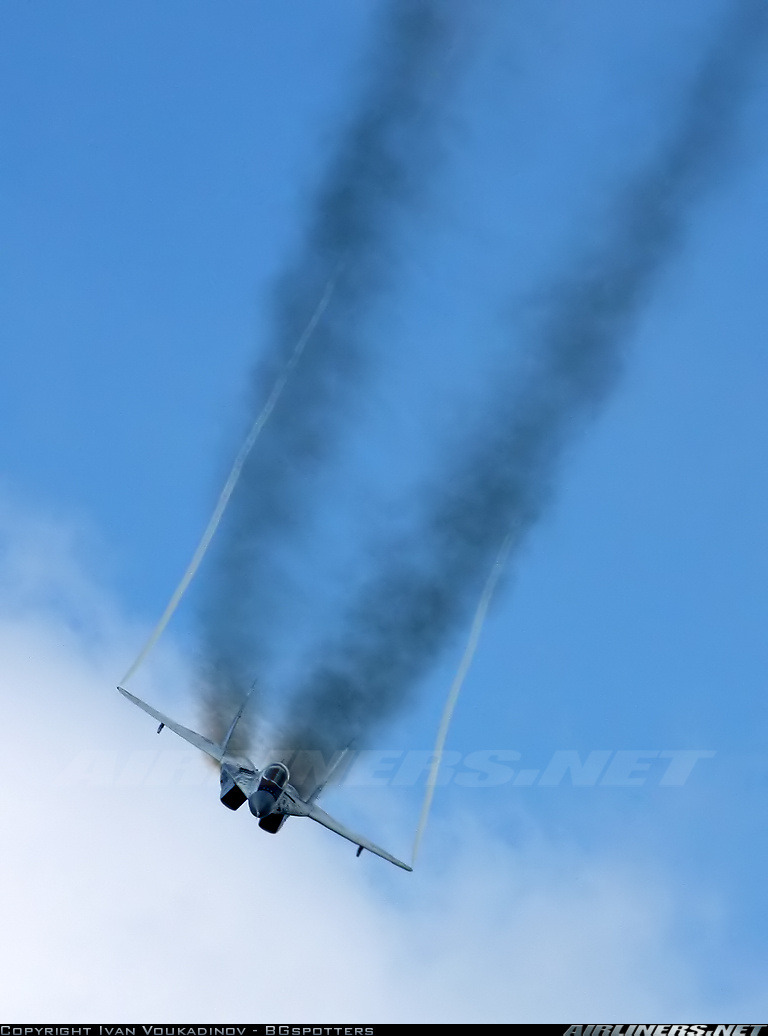 [매연을 뿜으며 고속기동을 하고 있는 MIG-29UB 복좌형의 모습 장착한 투만스키 RD-33 은 낮은 연료소비율과 높은 추력으로 미그29에 경이적인 기동성을 부여하고 있지만 연료가 완벽하게 타지 않아 이처럼 매연을 발생시키는 경우가 많은게 흠이다. 전투기에 있어 이런 먀연은 적에게 발견될 가능성이 높다는 점에서 바람직하지는 않다]