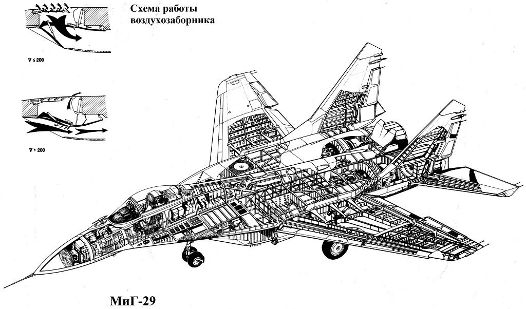 - MIG-29의 조종석은 이전의 구소련 전투기와 달리 내부가 넓고 깊이가 얕을 뿐만 아니라 조종석 전방 윈드 스크린(Wind Screen)에는 프레임이 없고 기수가 밑으로 쳐져 있어 전방시계가 양호 하다. 동체 밑에 낮게 설치된 엔진 공기흡입구는 외부물질에 의한 손상위험을 줄이기 위하여 지상활주시 주공기 흡입구를 닫고 상면의 보조 공기흡입구를 사용하며 이륙시 전방착륙 바퀴가 들리면 주공기 흡입구의 문이 열려 공기를 흡입하게 된다.