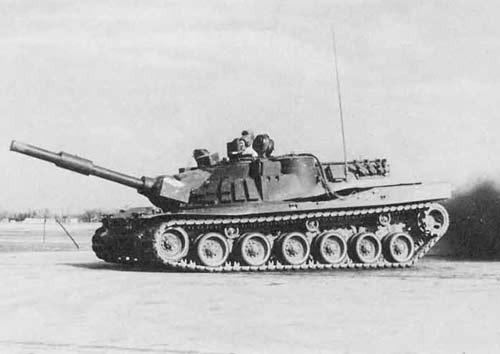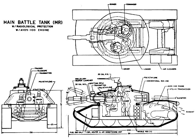 [MBT-70 은 미국과 서에서 동시 개발되었는데미국측은 1470 마력(1096 kW)의 AVCR 공랭식 12기통 디젤엔진을 장착하고 152밀리 시레일러 포발사 미사일을 장착한 타입을 개발했다]
