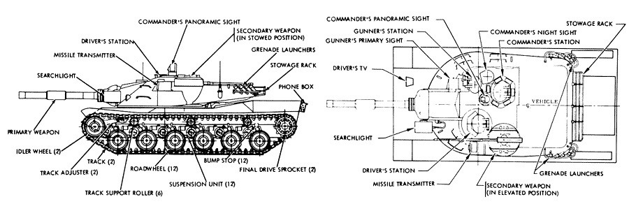[MBT-70 은 오늘날의 복합장갑과 비슷한 적층식 장갑의 용접식 차체에 유기압 현수장치(조종수에 의한 차고 제어 - 노상 주행시 최저지상고 10cm, 야지주행시 70cm)를 도입하고, NBC 방호 공기정화시스템, 원격제어 되는 20 mm 기관포, 7.63 mm 동축 기관포, 각종 센서를 도입한 탄도 계산기, 안정화된 사통장비(레이져 거리 측정기,열상장비 포함)를 장착한 50톤의 중형급 전차로 계획대로 개발되었다면 당대의 최고 성능을 가진 전차로 개발되어질뻔 했었다 물론 결과는 실패로 끝났다]