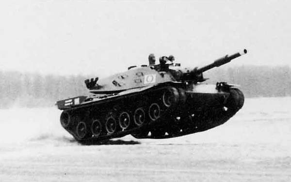 [MBT-70 의 기술수준이 어떤지 잘 보여주는 사진으로 오늘날 전차에도 잘 쓰이지 않는 유기압 현가장치를 통한 무릎꿇기 대구경 무장 그리고 발달된 사통장치등 오늘날 3세대급 전차가 갖추어야 할 기본조건을 모두 갖춘 모습을 잘 보여주고 있다 MBT-70 은 아직 완성되지 않은 미래의 기술등이 적극 도입된 꿈의 전차였다]