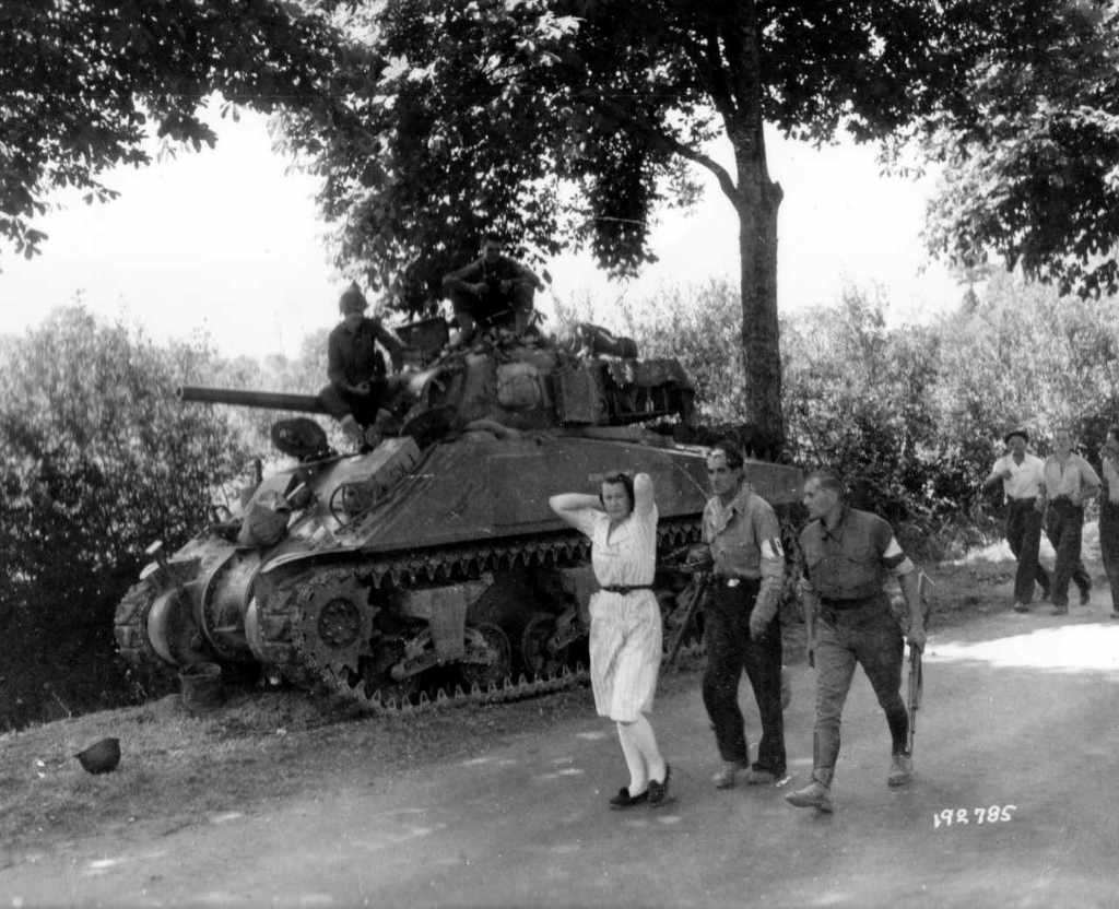[노르망디 상륙작전 이후 독일군에 협력한 여성을 체포해가는 프랑스 시민군의 모습과 셔먼... 3단으로 분리된 트랜스미션 커버 구형 현가장치 그리고 75밀리 포로 보건데 M4 A3 중기형 (좌우로 열리는 커버와 탑승자가 미군이라는점에 주의) 으로 보인다]